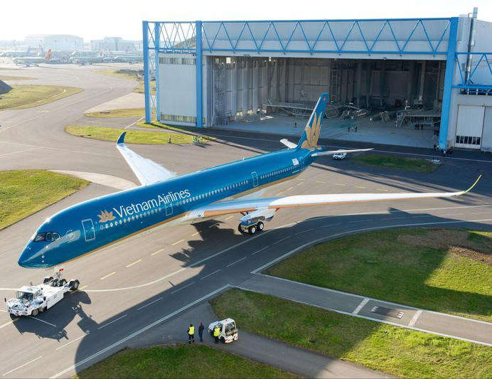 (Aeronoticias).- El primer A350 XWB de Vietnam Airlines ha salido del taller de pintura de Airbus en Toulouse, Francia, con la distintiva librea azul y la flor de loto en oro de la aerolínea, que destinará este avión a sus rutas de larga distancia entre Hanoi y París.