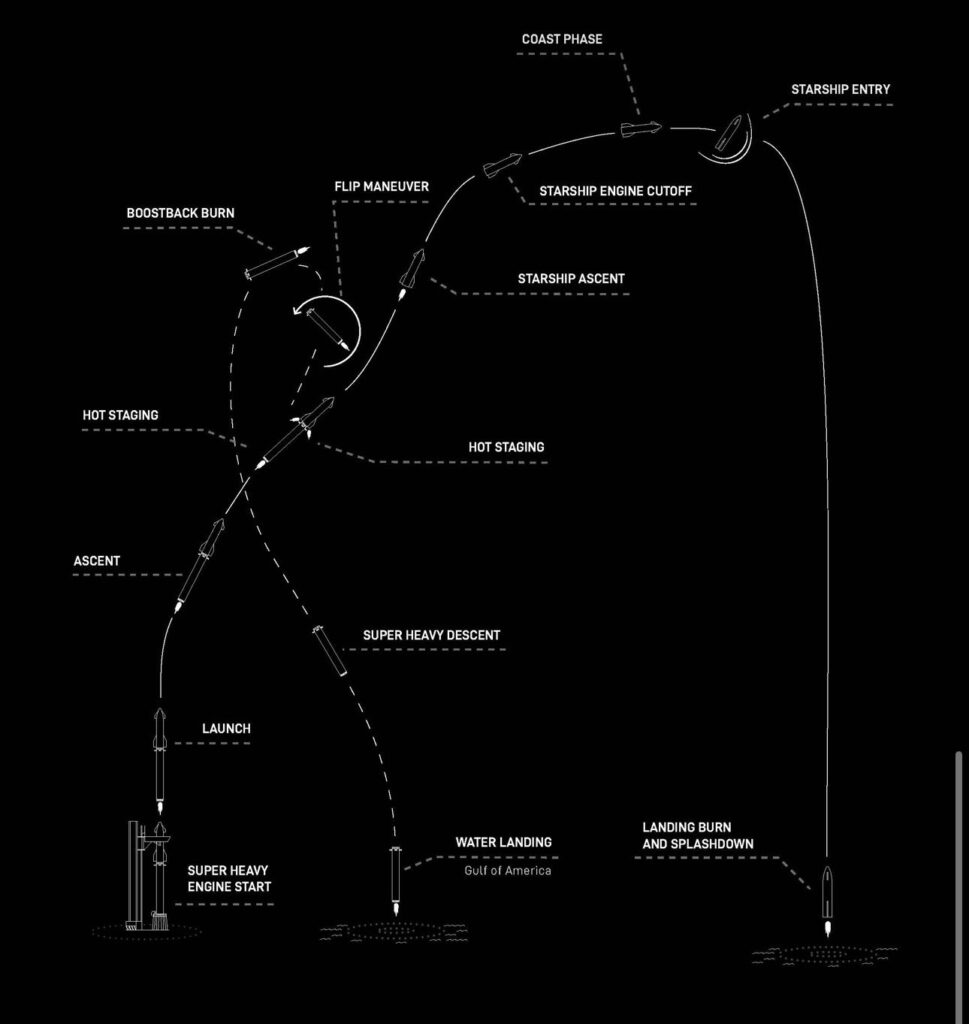 En su undécimo vuelo de prueba, Starship operará como plataforma para diversas experimentaciones técnicas: desplegar simuladores de satélites similares en tamaño a los Starlink, apoyar una ignición de motor en órbita (relight) y probar una configuración innovadora de quemado de aterrizaje del booster. A diferencia de vuelos anteriores, en esta ocasión no se buscará retornar al sitio de lanzamiento, sino que el Super Heavy caerá al Golfo de México, con una secuencia de igniciones progresivas de motores (13 al inicio, transición a 5 en la fase de desviación y finalmente los 3 centrales) para validar los cambios planteados en la versión futura V3 del cohete. Todo esto mientras se evalúa el comportamiento del escudo térmico, incluso con baldosas retiradas parcialemente para forzar estrés en zonas críticas. La etapa superior (Starship) descenderá hacia el océano Índico tras maniobras de guiado dinámico y bancadas controladas.