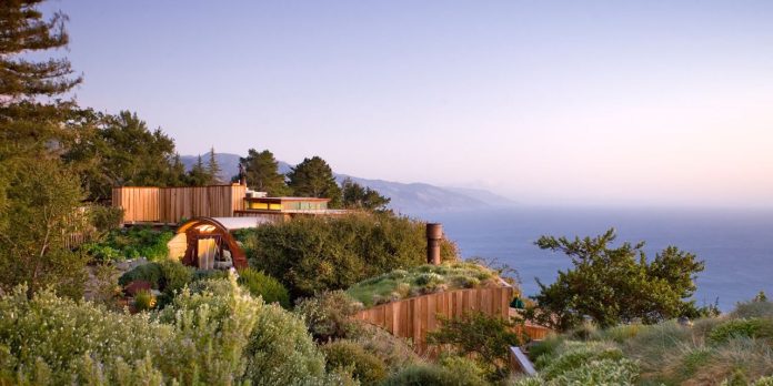 Construido en 1992 sobre las antiguas tierras del pionero William Post, el hotel fue diseñado por el arquitecto visionario Mickey Muennig, quien aplicó principios de arquitectura orgánica inspirados en Frank Lloyd Wright. Todo el complejo parece crecer del suelo mismo: las 39 residencias se ocultan entre los árboles, con techos cubiertos de hierba, estructuras de madera reciclada de secuoya y cristales orientados hacia el infinito azul del océano. No hay líneas duras ni artificio: solo curvas suaves que siguen el contorno de la montaña.