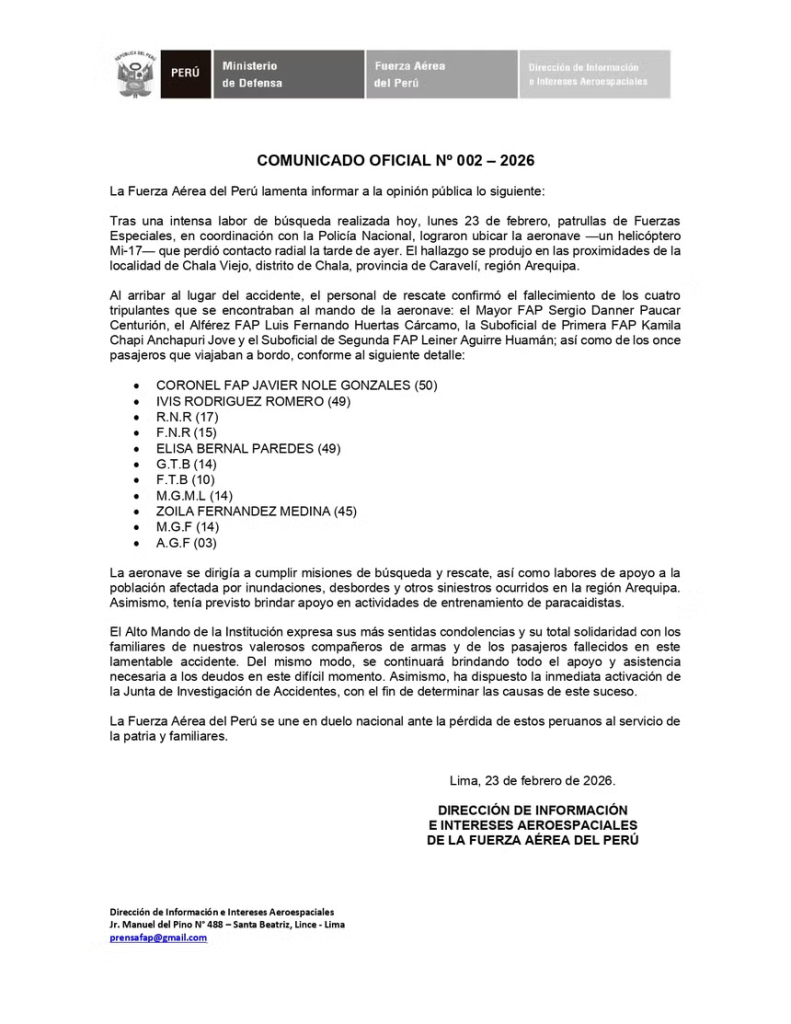 «Tras una intensa labor de búsqueda realizada hoy, lunes 23 de febrero, patrullas de Fuerzas Especiales, en coordinación con la Policía Nacional, lograron ubicar la aeronave —un helicóptero Mi-17— que perdió contacto radial la tarde de ayer. El hallazgo se produjo en las proximidades de la localidad de Chala Viejo, del distrito de Chala, provincia de Caravelí, región Arequipa», informó la FAP.